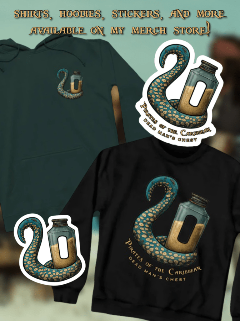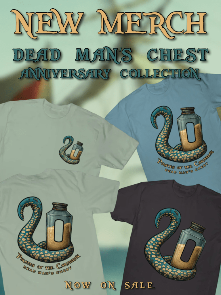 To celebrate the 20th anniversary of Pirates of the Caribbean: Dead Man’s Chest, new anniversary merchandise is now available in the Podcasts of the Caribbean Merch Store!